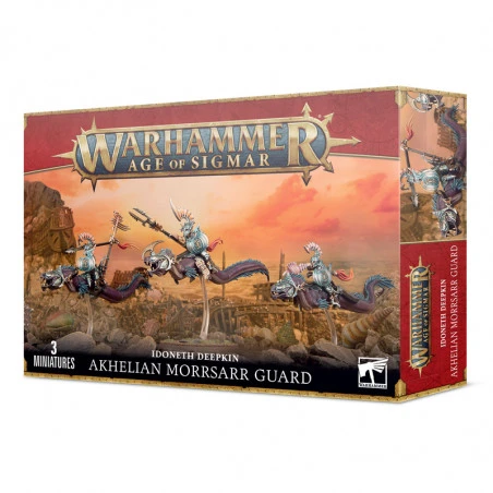 Ce kit plastique contient les composants nécessaires pour assembler 3 Ishlaen Guards. Chacun a pour monture une Fangmora Eel, une bête asservie agile et sinueuse contrôlée grâce aux solides rênes et œillères assujetties à sa tête, et qui attaque avec sa gueule garnie de crocs et sa queue fouetteuse. Les cavaliers Akhelians portent de solides cuirasses, même s’ils ont les bras nus et les jambes protégées par de la cotte de maille et de la toile dans un souci de mobilité. Ils manient des sabres funestes à la lame dentelée et des boucliers galvaniques, et ils portent un heaume fermé sinistre au cimier affûté – un modèle particulier est inclus pour dénoter un Lochian Prince en guise de chef d’unité. Les options permettent de monter un musicien avec conque et casque découvrant son visage, plus un porte-étendard dont l’anguille Fangmora est munie d’un grand pennon. Le kit propose de nombreux accessoires pour agrémenter les montures et les socles – filets, cordages, bouteilles et autres lampes.