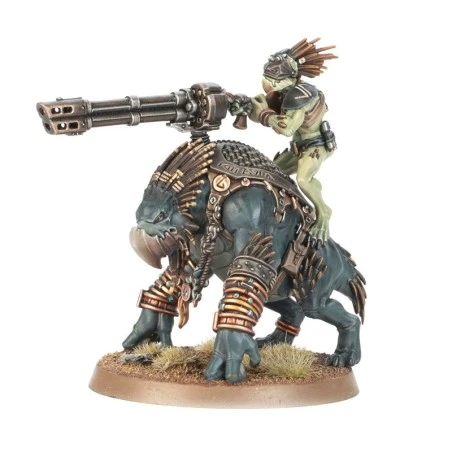 Ce kit en plastique permet d’assembler un Cavalier Krootox, une bête parente kroot âgée sur le robuste dos de laquelle est perché un artilleur.