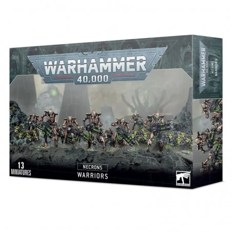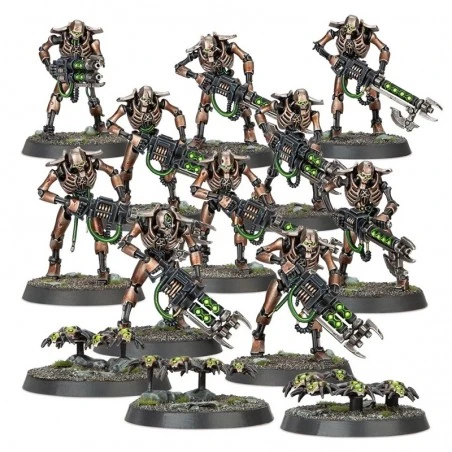 Ce kit permet d’assembler dix Guerriers Nécrons, chacun avec deux têtes au choix et en option un écorcheur Gauss ou une faucheuse Gauss, ainsi que trois Nuées de Scarabées Canopteks. Le tout est à emboîter, et ne nécessite donc pas de colle. Le kit est fourni en 70 composants plastique, plus dix socles ronds Citadel de 32mm et trois socles ronds Citadel de 40mm à trou hexagonal.