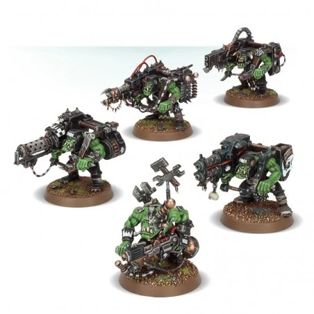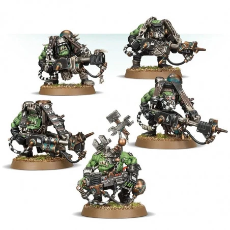Ce kit plastique contient suffisamment de pièces pour assembler cinq figurines : 4 Lootas ou 4 Burna Boyz, plus un Ork Mek avec méga-blasta kustom. Figurines fournies avec des socles ronds de 32 mm.