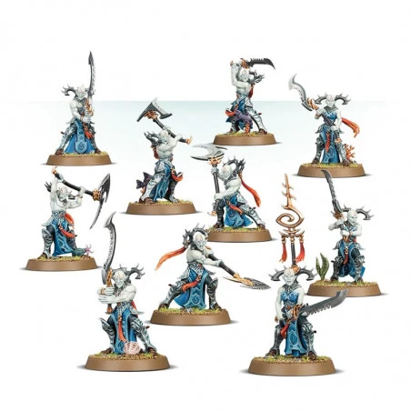 Ce kit plastique contient les composants nécessaires pour assembler 10 Namarti Thralls. Ils portent une armure bien plus simple que celle de leurs officiers supérieurs, eu égard à leur nature d’âmes décrépites et remplaçables, ce qui ne les empêche pas d’être physiquement robustes et musclés. Il y a 11 têtes dans le kit, à mettre indifféremment sur les corps de votre choix; toutes sont chauves et aveugles, avec les orbites vides. Il y a aussi 10 collerettes élaborées, qui montent en s’incurvant derrière la tête au point d’évoquer des cornes. Leurs armes sont très variées, et si chacun manie une lame lanmari à deux mains, on trouve les modèles suivants: 4 peuvent avoir vouge ou épée, 3 peuvent avoir hache ou épée, 2 ont une épée et 1 une hache. Il y a une option de porte-icône, avec une tête qui lui est propre, et sur la crête une grande rune d’asservissement mathlann. En guise de détails supplémentaires, le kit propose 6 éléments de décor et d’animaux marins, à ajouter à vos socles comme vous l’entendez.