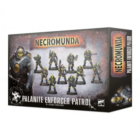 Ce kit plastique est fourni en 156 composants permettant d’assembler 10 Palanite Enforcers, plus 10 socles de 25mm pour Necromunda et une planche de décalcomanies pour Palanite Enforcer Patrol. Les règles pour jouer une Patrouille se trouvent dans The Book of Judgement.