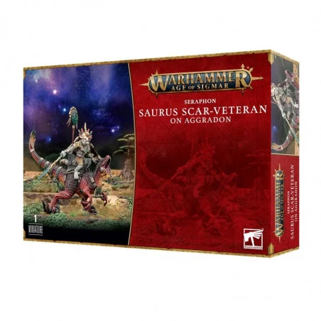 Ce kit plastique permet d’assembler un Vétéran Scarifié Saurus sur Aggradon, un chef de guerre séraphon chevauchant une féroce monture rugissante