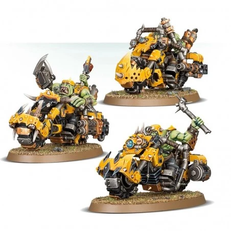 Cette boîte contient 3 Ork Warbikers en plastique, plus les options pour représenter un Nob à moto et de nombreux accessoires.