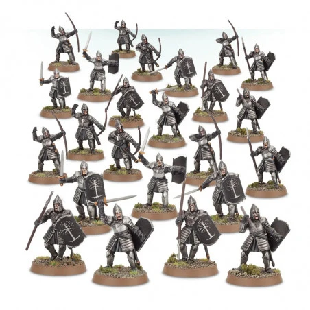 Cette boîte contient 32 composants avec lesquels assembler 24 Guerriers de Minas Tirith plastique : 8 avec arc, 8 avec épée et bouclier, et 8 avec lance et bouclier. Ils sont fournis avec 24 socles ronds de 25mm. Figurines à assembler et à peindre. Nous recommandons l’usage de la Colle Plastique et des Peintures Citadel.