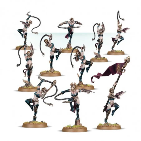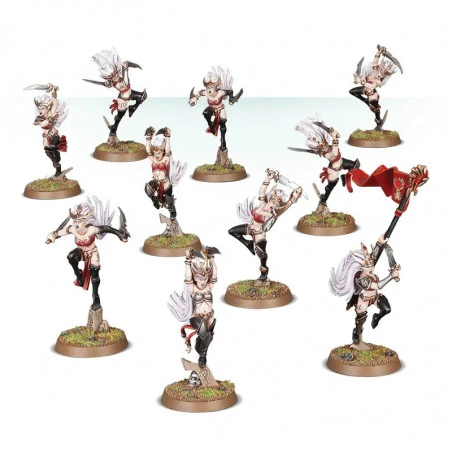 Les Witch Aelves sont fournies en 67 composants, plus 10 socles ronds Citadel de 25mm et une planche de décalcomanies pour bannière. Ce kit peut, sinon, servir à assembler 10 Sisters of Slaughter.
